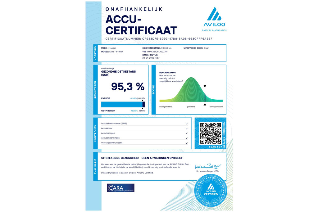 Mooie Hyundai Kona EV Fashion 64kWh 2020. Aviloo batterij test SOH score van 95%. Zie foto's voor rapport.